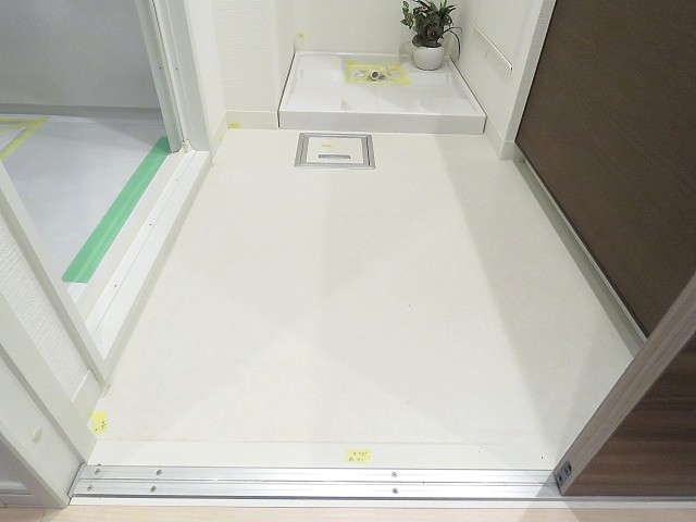 マルチクローゼットの向かい側は洗面室。洗面化粧台、洗濯機置場、バスルームがまとまっています。入口に段差がないのでつまづく心配もありません。