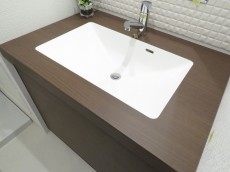 洗面化粧台は木目のカウンターと壁面のタイルが印象的。横の壁面には小物が置けるよう棚が設けられています。