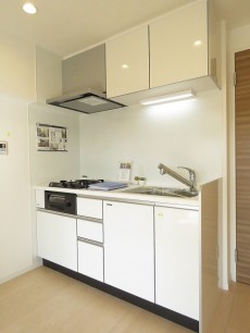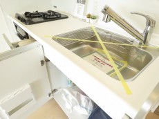 キッチン。水栓は浄水機能付き、コンロは2口ガスコンロです。