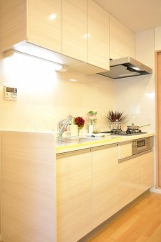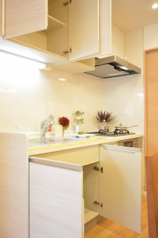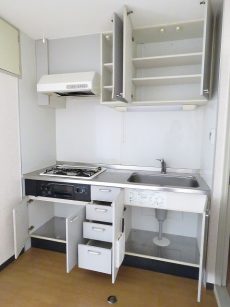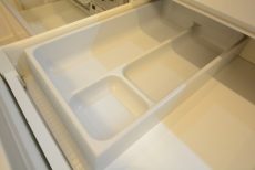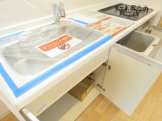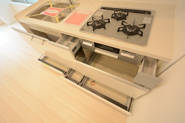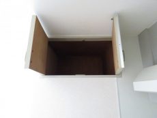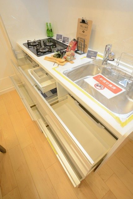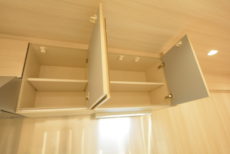 収納は吊戸棚と調理台下の引き出し。引き出しタイプはぎっしり詰めても出し入れしやすいのが特徴です。吊戸棚は、使う方の身長によっては多少使いづらいかもしれませんね。あまり使わない物を収納するとか、収納グッズを使うとか、工夫が必要そうです。