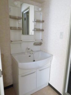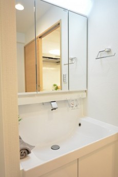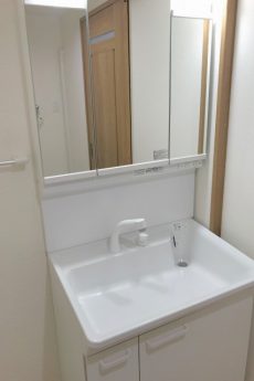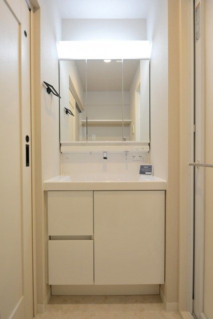 真っ白で清潔感のある洗面台は三面鏡付き。上部に照明も付いて鏡を使う時に影になったりもしません。