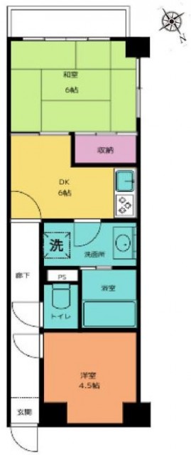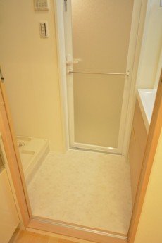 入口入って右手に洗面化粧台、正面にバスルーム、左手に洗濯機置場の