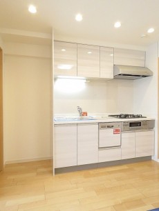 キッチンはホワイトでほんのりとした木目調。浄水機能付き水栓、食洗機、3口ガスコンロ、収納スペースたっぷりとスペック◎!設備が整っているとお料理するのも楽しくなりそうですね。