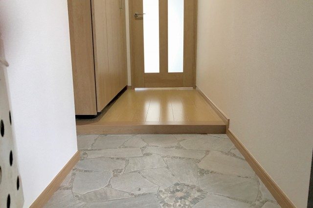 玄関から廊下にかけては高級感のある大理石貼り!冷たい雰囲気になりがちな大理石ですが、温かみのある色にする事で柔らかな雰囲気になっていますね。