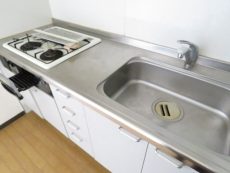 水栓は浄水器付き、コンロは3口。ペットボトルのお水を買わなくても浄水したお水が手軽に使えるのがうれしいですね。ダイニングキッチン内には窓がないので、お料理の際には換気扇をONにするのを忘れずに・・・