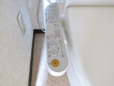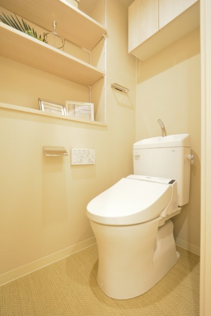 トイレは洗浄便座付き。TOTO製のウォシュレットです。ちなみにウォシュレットって呼んでいいのはTOTO製だけなんですよ。最近まで知りませんでした^^;)トイレットペーパーなどの収納に便利な吊戸棚や、いろいろ飾れる棚など、収納も豊富♪♪