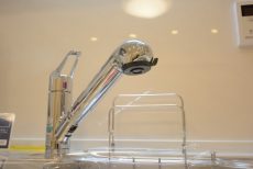 水栓は浄水機能付きシャワー水栓。切替えるだけで気軽に美味しいお水を使えます。ヘッドが伸びるのでシンクを流したりにも便利ですよ。