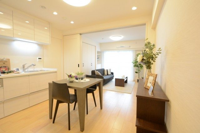 バルコニーに向かってキッチン、ダイニング、リビングと並べたレイアウト。スペースを有効に使えるのでよく見かけますよね。キッチン前に設置したカウンターテーブルをダイニングとしたことによって、ゆとりのあるリビングスペースを実現しています。置いてある家具はディスプレイ用なので付いてはきませんが、実際の生活をイメージする参考にしましょう。