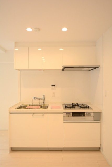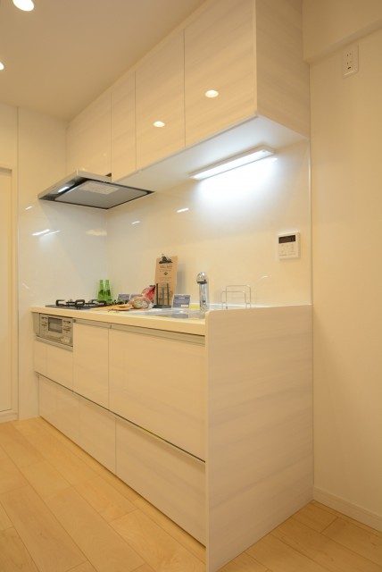 真っ白なシステムキッチンは3口コンロに浄水機能付水栓付き。