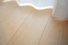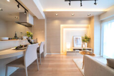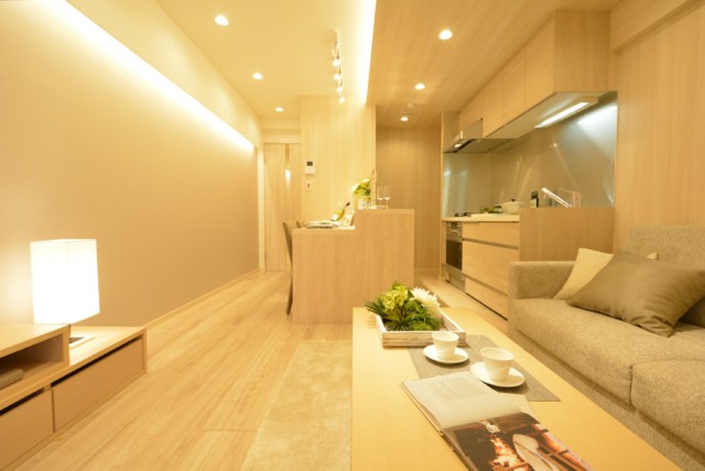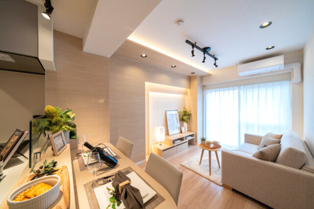 南東向きのバルコニーに面したお部屋です。ナチュラルカラーでコーディネイトされた温かみのある雰囲気でとても居心地が良さそうですね。リビングダイニング部分には木目パネルが立体的に造作され、間に付けられた間接照明によって奥行きのある広がりを感じさせてくれます。