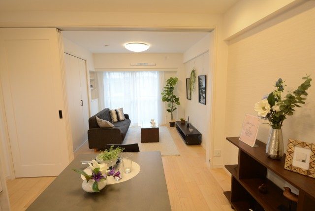 こちらはリビング・ダイニング・キッチン+洋室。奥に見える洋室の仕切り戸を開け、リビングの一部とした様子です。LDK自体に窓がありませんので、日中はこんな使い方が良さそうですね。