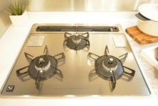 コンロは3口、グリルも付いています。グリルってお魚イメージが強いと思いますが、野菜や肉、パンなど何を焼いても美味しいんですよ。手軽にガスの直火を使えるのが珍しいらしく、海外の方には好評とか。そういえば、海外だと本格的なオーブンのイメージですよね。
