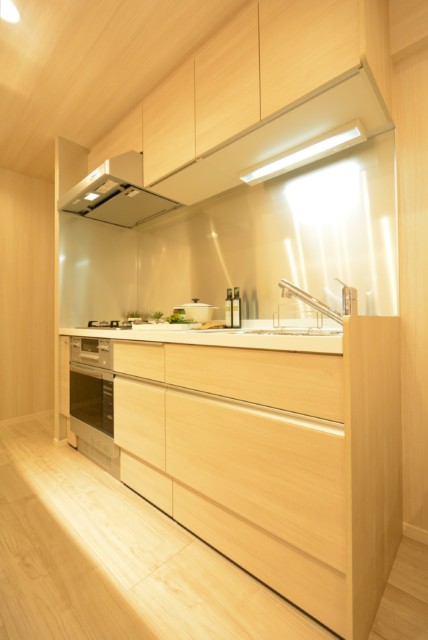 キッチンは壁付けタイプ。ただ、カップボードが背後に設置されているのでアイランドキッチンのようなイメージですね。壁や天井とお揃いのパネルを使用した、お部屋と一体感のある調理台です。