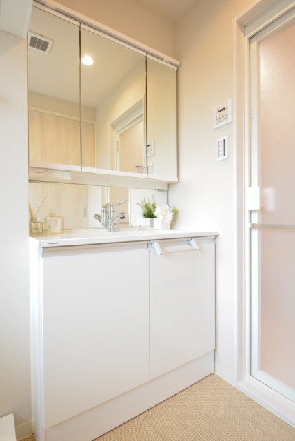 洗面室には洗面化粧台の他に洗濯機スペースと浴室があって脱衣所を兼ねています。洗面化粧台は身だしなみチェックに便利な三面鏡付。裏がキャビネットになっているので、洗面周りの細々としたものもスッキリと収納可能です。ランドリー用品は洗濯機スペースの吊戸棚へどうぞ。