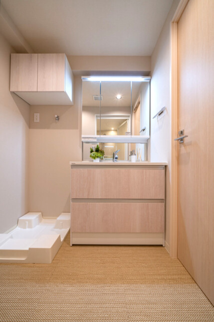 脱衣スペースを囲むように洗濯機置場、バスルーム、洗面化粧台が並んでいます。キッチンと近いとお料理しながらお洗濯・お風呂の支度と家事の動線も良好です。