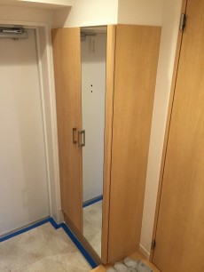 玄関の左側にはシューズボックスがあります。可動式の棚なので、靴のサイズに合わせてご自由にアレンジしてください。扉には大きな姿見があるのでお出かけ前のチェックもバッチリです♪