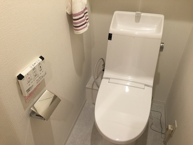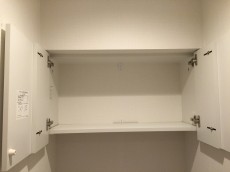 廊下左手に、ウォシュレット付きのトイレです(●’∀’●)新規交換済みでピッカピカ。上部に扉付きの棚が付いているのでトイレ用品の収納にお使いいただけます。