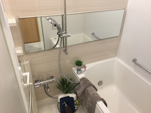 シャンプーなどのボトルもキレイに並べて置ける棚があり、清潔感のある空間を保てますね◎水切れの良い床は、すばやく乾燥、楽々お手入れ♪♪浴室乾燥機もついているので、雨の日のお洗濯も困りません!