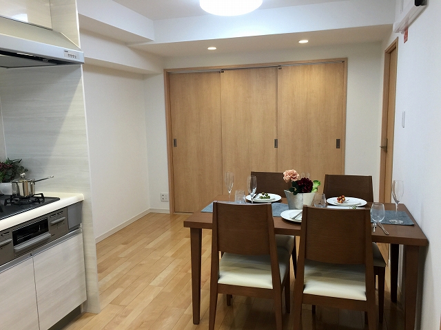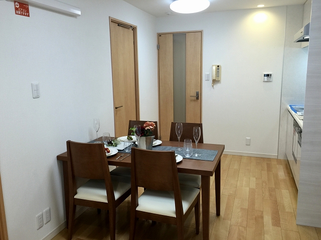 ダイニングキッチンは、約8.4帖。ナチュラルな色調のフローリングが素敵なお部屋です(●´∀`)窓は設置されていません。改めまして、こちらの物件は、家具付きの販売なのでダイニングセットも含まれています(*´˘`*)♡