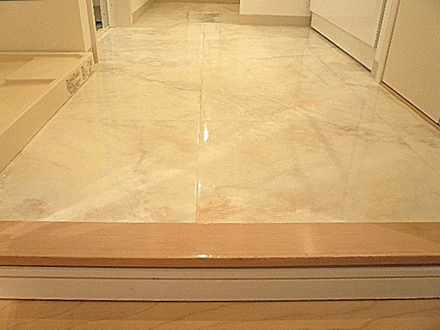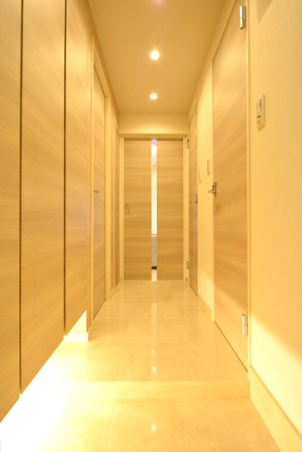 玄関から廊下にかけては揃いの大理石が貼られています。素材的に冷たい雰囲気になりがちですが、建具の木目や照明などで柔らかい印象になっていますね。