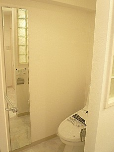正面にあるトイレです。こちらは扉がなく洗面台とトイレの間にあるブロックガラスで仕切られています。