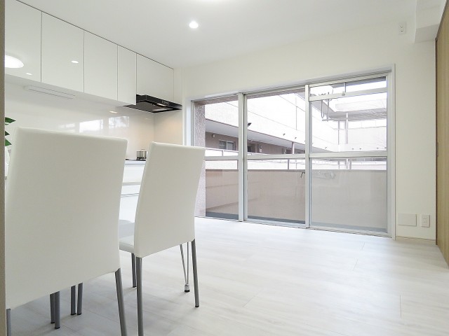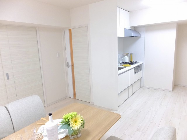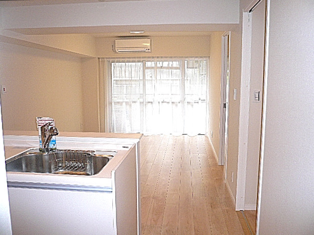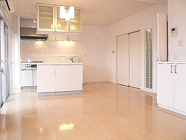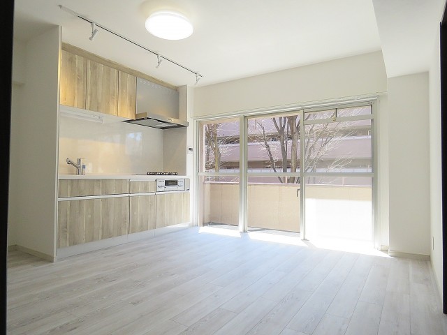 こちらはリビング・ダイニング・キッチン。北東向きのバルコニーに面したワイドスパンの明るいお部屋です。キッチン部分とリビング部分に分かれていて、ダイニングはキッチンカウンターで代用しているようですね。