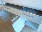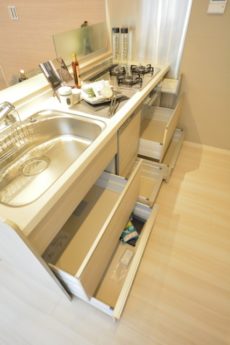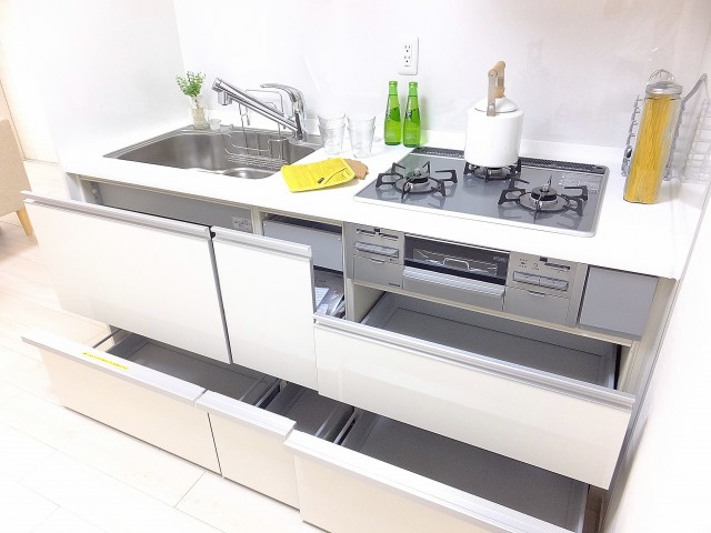 調理台下はスライドキャビネットと食器洗浄乾燥機。スライドキャビネットは出し入れがしやすく、楽に収納出来るのが特徴です。たくさん入れてもが見やすいのも便利ですね。食洗機は手荒れに悩む方にはピッタリ。食後の時間をのんびり過ごせるのも嬉しいです(^^♪