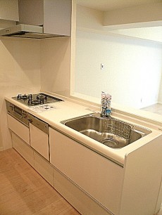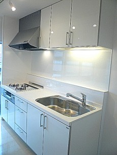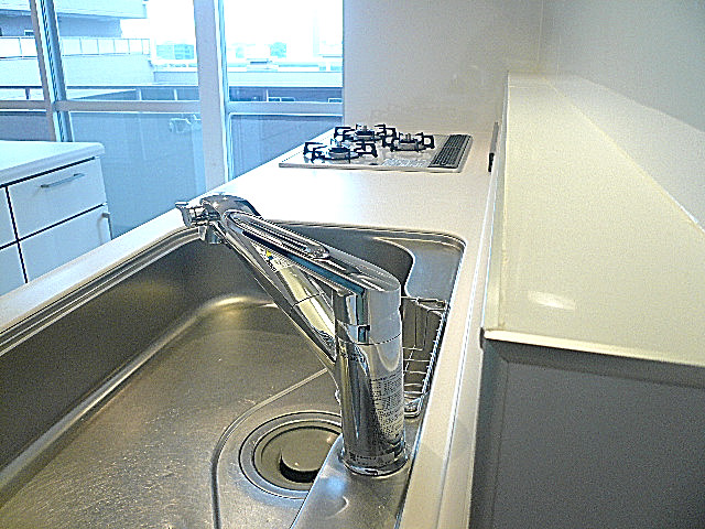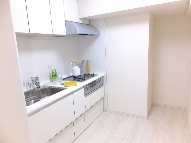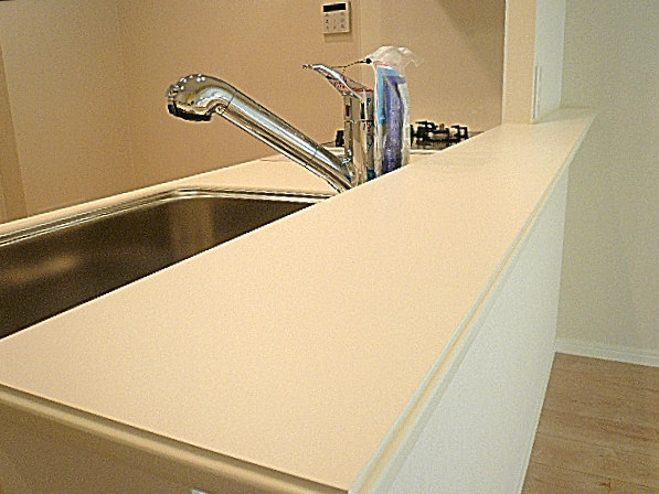 ホワイトな清潔感漂うカウンター収納・システムキッチンです。シンク広々~大きなお鍋も力いっぱい洗えそうです!
