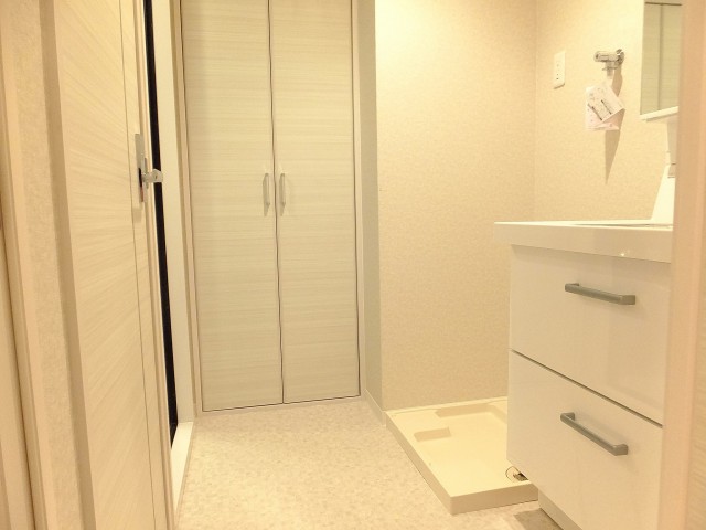洗面台と洗濯機置場はお隣同士。洗面台の大き目引出しには掃除道具や洗剤・シャンプーなどのストックを入れておくと便利ですね☆
