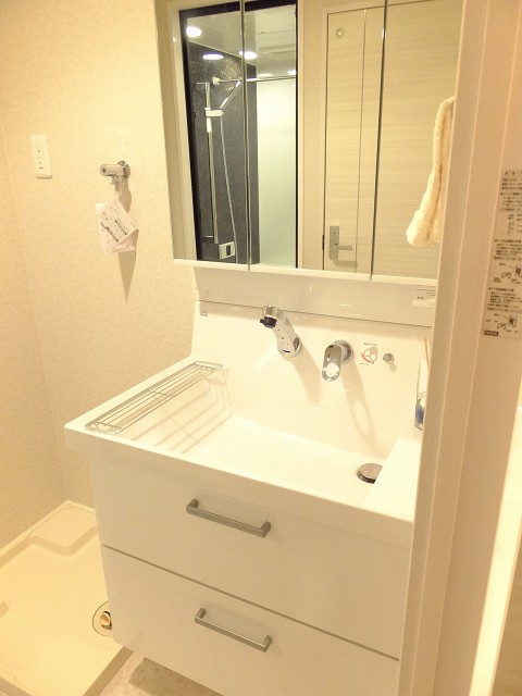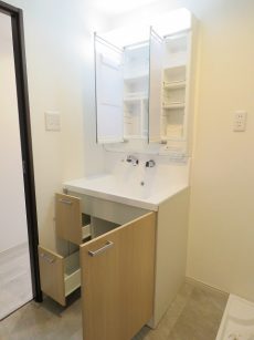 洗面化粧台です。上下にはしっかりと収納もありますので、ゴチャゴチャしがちな洗面台もスッキリと整頓できそうです。下部はスライド式収納になっています、出し入れもしやすいでしょう。
