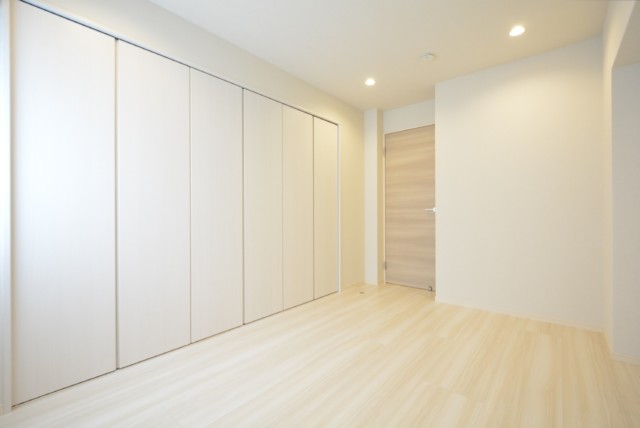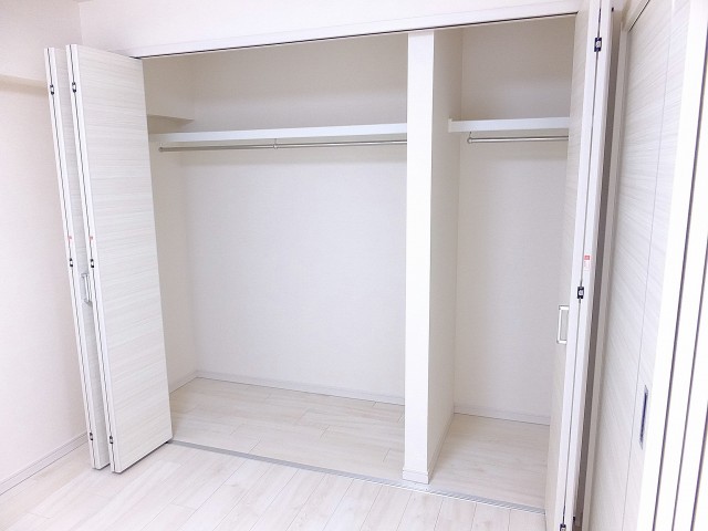 洋室6.5帖です。奥行きあるクローゼットが設置されています。日々毎日着る服はお部屋に、季節によって仕舞っておく服はウォークインクローゼットに。