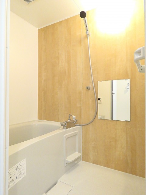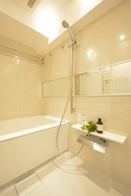 ベージュのアクセントパネルが柔らかい雰囲気を演出~リラックスな入浴タイムがおくれそうです~シャワーは、使いやすい位置でセット可能です。