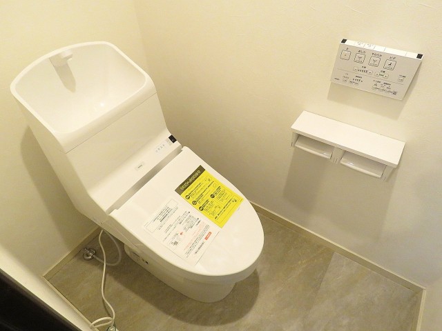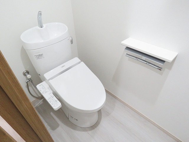 洗浄便座付き。TOTO製のウォシュレットです。トイレットペーパーなどのストックに便利な吊戸棚も付いていますよ。
