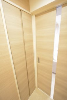 続きまして~廊下右手にある引き戸を開けますと、左手に洗濯機置き場、正面に浴室があります。