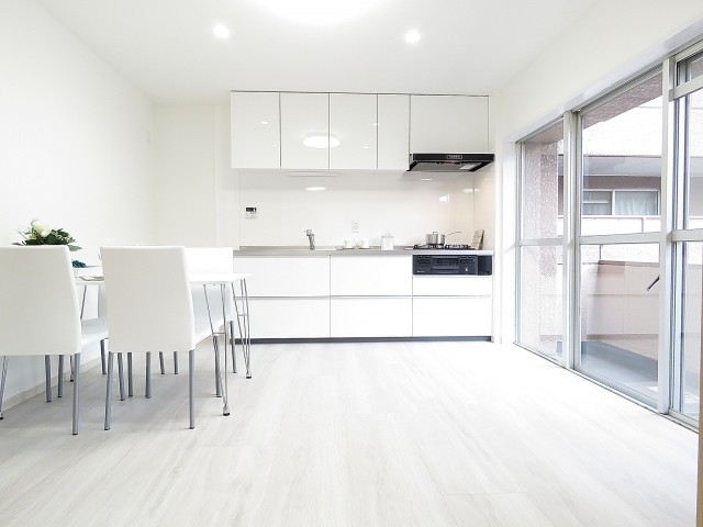リビングダイニングキッチン14.1帖です。バルコニーに面しているので日当たりバッチリの明るいお部屋です。