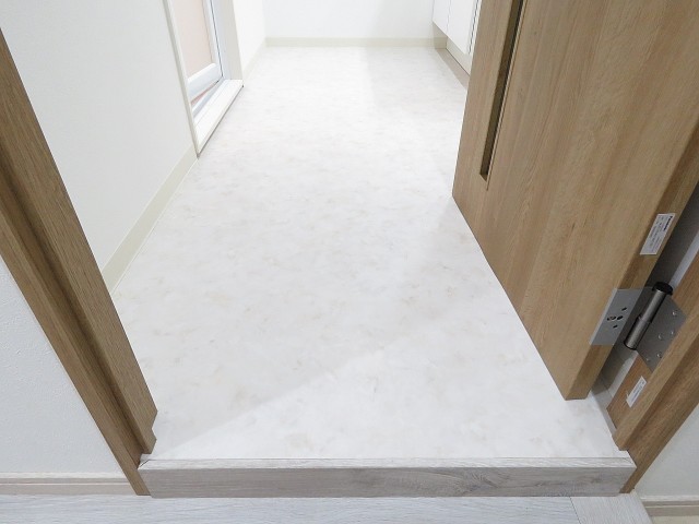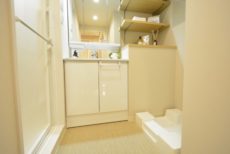 洗面室には洗面台の他に、浴室、洗濯機スペースがまとまっていて、脱衣所も兼ねています。こちらも段差に注意しましょう。