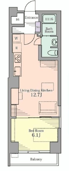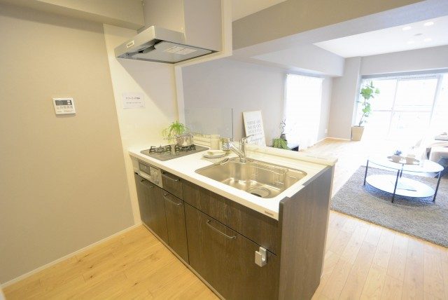 キッチンは壁付けタイプですが、横向きなのであまり目立ちません。調理台手前に冷蔵庫を置くことになるので、ほぼ独立タイプといってもよさそうです。
