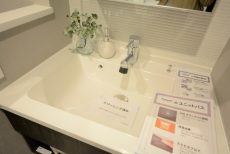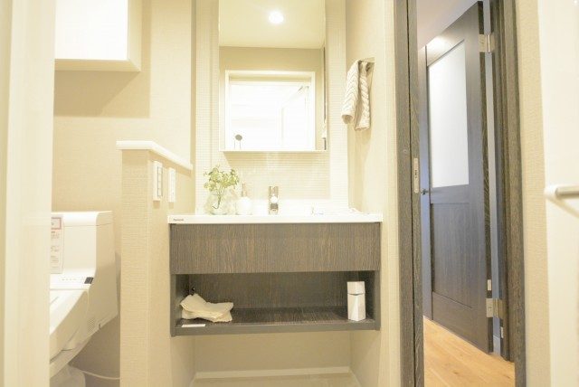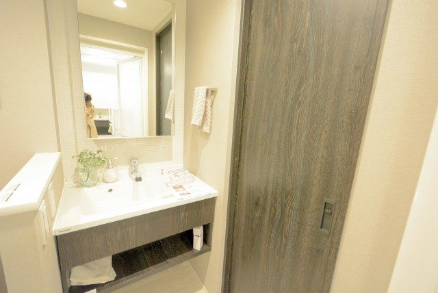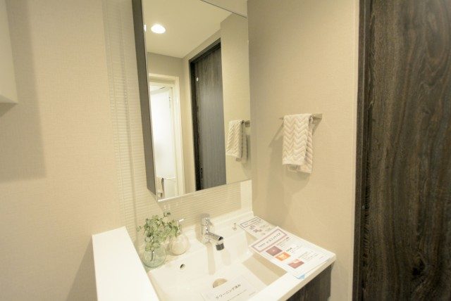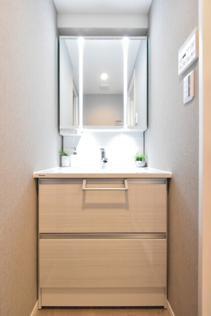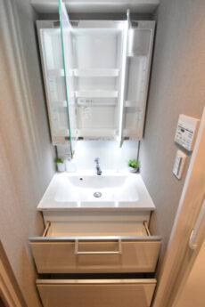 洗面台は360°チェック出来る三面鏡付き。鏡の間に付けられた照明のおかげで鏡を見る時に影になることもありません。LED万歳ですね♪