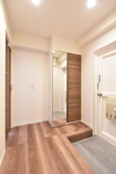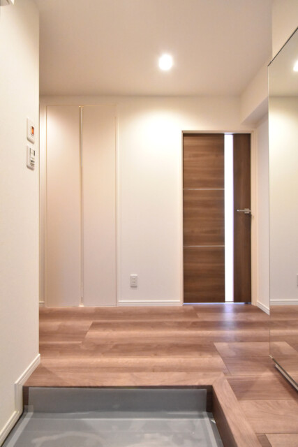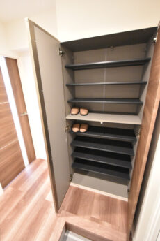 人感センサーが自動的に照明を点けてくれるので、荷物で両手がふさがっていても大丈夫!暗い中手探りでスイッチを探す必要もありません。なにより、いつでも明るい玄関が迎えてくれるのは嬉しいものです(^^♪ シューズボックスはトールタイプ。収納力は抜群で、可動式の棚を調節すればブーツなどでも収納可能ですよ。