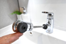 ノズルが伸びる水栓は、洗面ボウルを流したりに便利です。収納は三面鏡裏のキャビネットと洗面台下。細々した物が多くなりがちな洗面周りには豊富な収納が有り難いですね。大きな物から細かい物までバランスよく納まりそうです。