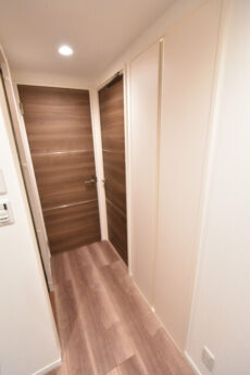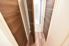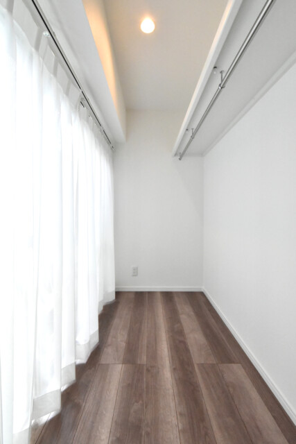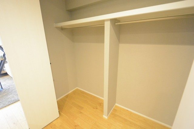 2帖くらいあるでしょうか、柱などもないきれいな四角の収納です。スーツケースなどの大きい物を置くことも出来ますし、チェストや衣装ケースなどを置いて収納力をアップさせるのもアリですね。