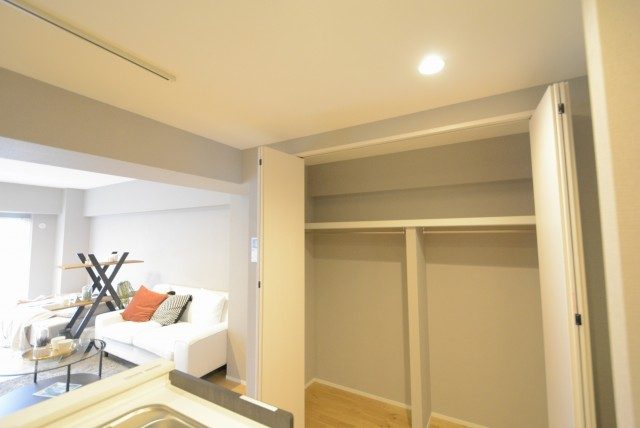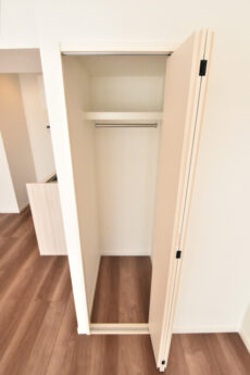 LDKにもクローゼット付き。ハンガーポールは付いていますが、洋服以外のものを入れるのもいいかも。