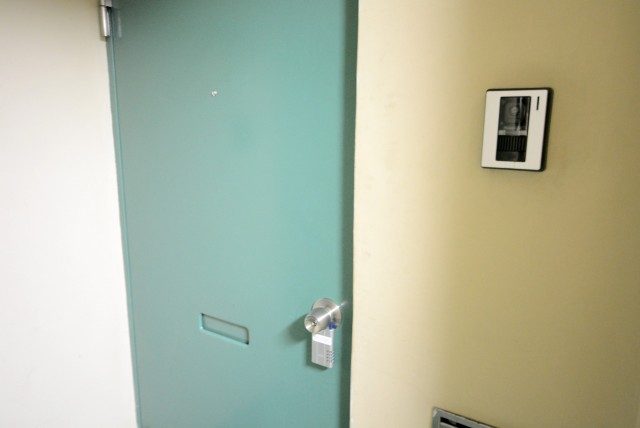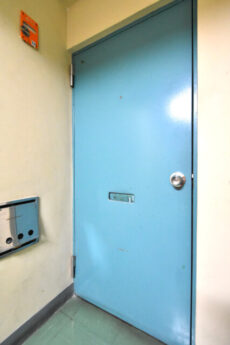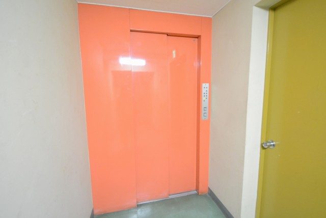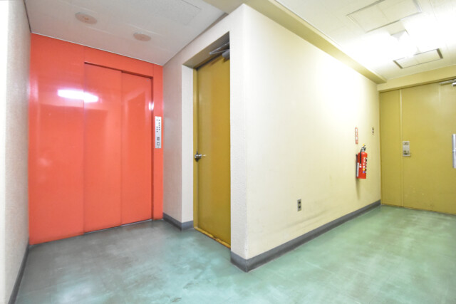 オレンジのエレベーターで4階まで上がると、エレベーターホールに玄関が3つほど並んでいました。