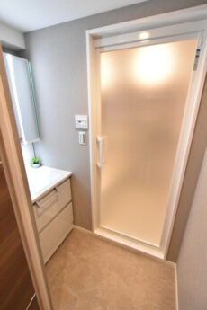 洗面室は、洗面台の他に浴室があって脱衣所も兼ねています。