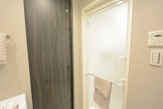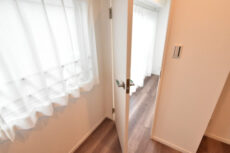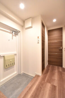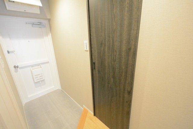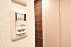 横にはモニター付きインターホンが設置されていて、お部屋の中から訪問者を確認する事が出来ます。映像を見てから応対するかを決められるので安心ですよ。