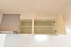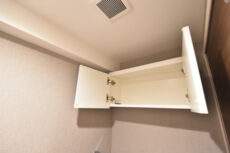 扉付の吊り棚がついているので、トイレットペーパーのストックやサニタリー用品などを