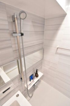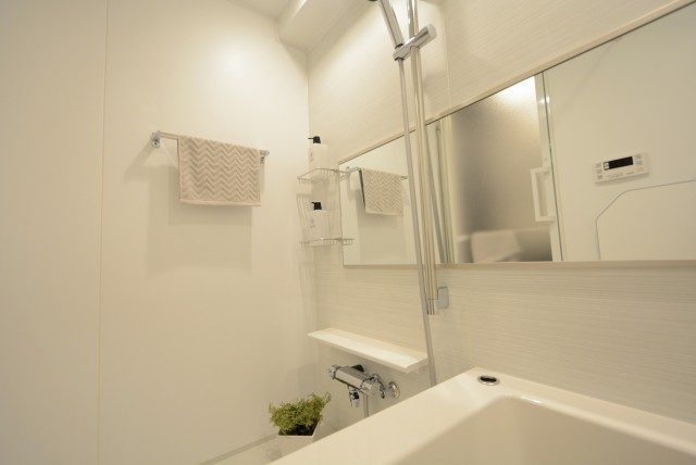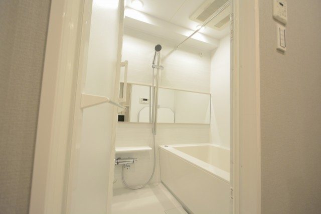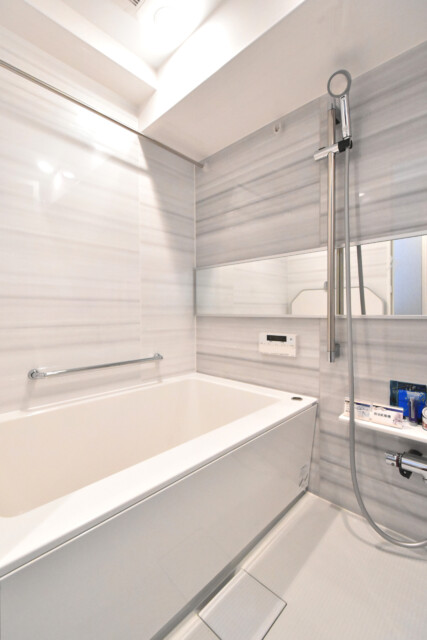 白基調のキレイなバスルームは、ワイドミラーなので広々お使いください!