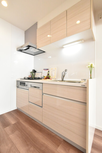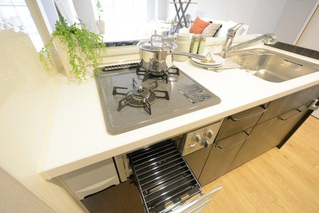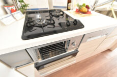 コンロは3口、グリルも付いて調理器具も充実。目立たなくても空気は流れますので、調理中は換気扇をお忘れなく。少し早めに回し始めると効果的らしいですよ。