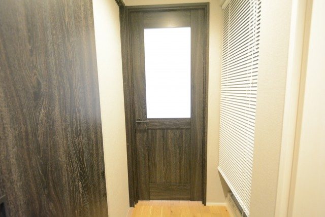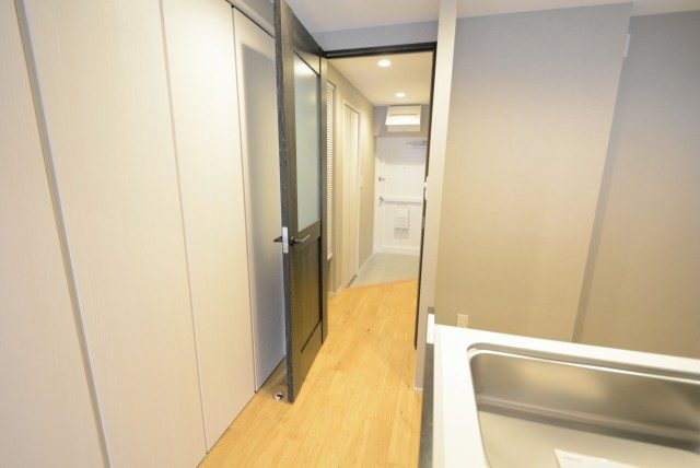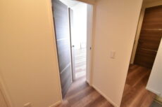 廊下の白い扉は洗濯機スペース。棚が付いていて、洗剤や洗濯ネットなどの洗濯グッズ一式を置いておけて便利です。