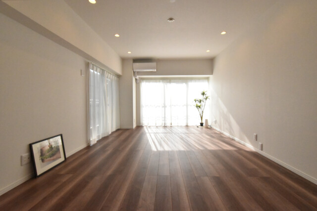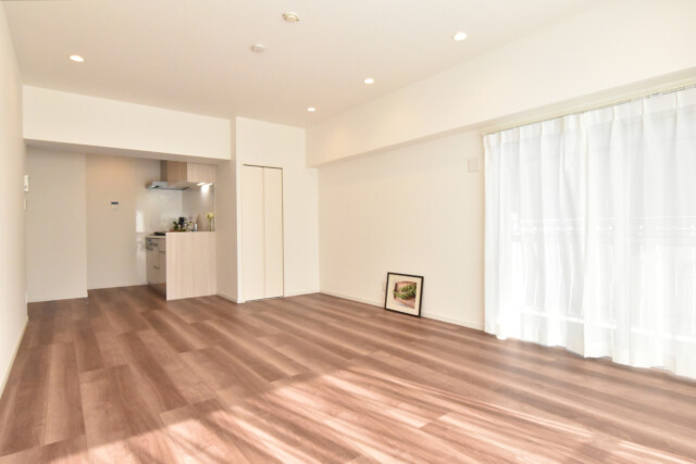 南・西向きのL字型バルコニーに面した明るいお部屋です。キッチンが入口近くの奥まったところにあり、残りの四角いスペースをリビングダイニングで丸々つかえるので、レイアウトも自由自在です。